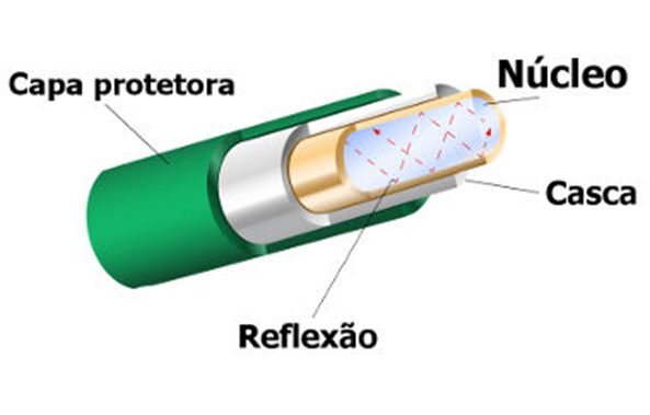 Por meio de conversores integrados aos transmissores, todo o sinal de dados é convertido em luz, que percorre o cabo dentro do núcleo, sofrendo reflexão devido a casca que envolve o núcleo. Uma outra camada compoe o cabo, a capa protetora. Esta protege a fibra óptica de agentes externo e impactos mecânicos.